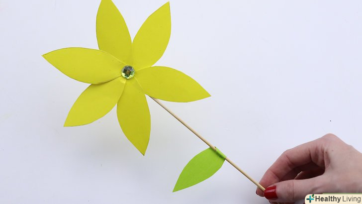 - Додайте листя до стебла. створити листя можна, вирізавши їх з паперу і намалювавши коричневим фломастером жилки, купивши штучні листя в магазині для рукоділля або навіть взявши зелене пір'я. Щоб прикріпити листя до стебла, використовуйте скотч, степлер (якщо стебло з соломи) або трохи клею.