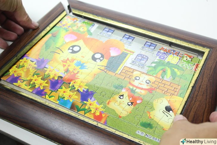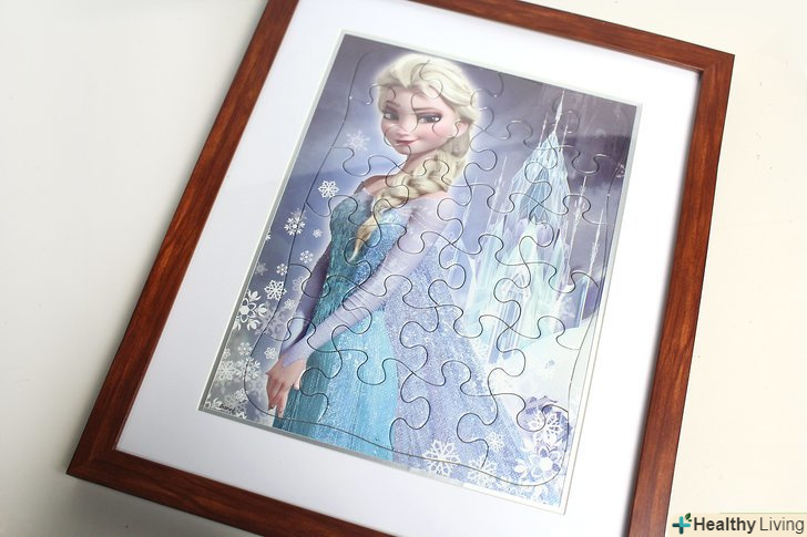 Обраміть пазл. як тільки пазл і матеріал основи підсохли, помістіть їх в рамку. Зафіксуйте основу в рамі за допомогою вкладок або кріплень на спинці, або будь-яким іншим методом вбудованим в рамку.- При бажанні, встановіть скло або твердий пластик поверх пазла, щоб захистити його від подряпин. Для кращого збереження кольору пазлів, використовуйте скло, стійке до УФ променів. [5]