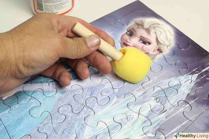 За допомогою кисті нанесіть клей на поверхню пазлів. купіть спеціалізований клей в хобі-гіпермаркеті або через Інтернет. Використовуйте кисть, щоб нанести клей по всій поверхні пазлів, покриваючи всю площу тонким шаром. Зверніть особливу увагу на щілини між деталями.- Якщо клей для пазлів йде у вигляді порошку, то спочатку ознайомтеся з інструкцією для його приготування перш, ніж використовувати.
