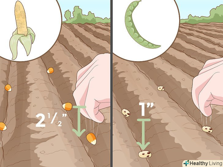 Покладіть насіння в ямку на глибину, зазначену в інструкції. вона може залежати від обраної вами культури. Як правило, м'ясисті рослини, такі як гарбузові (боби і горох) і дині, кабачки і огірки садять на глибину в 2-2,5 см, а кукурудзу і картоплю садять на глибину в 6-9 см.Після того як ви помістили насіння в ямку, присипте їх землею і ущільните (злегка поплескуючи долонею), для того щоб лунка не засохла занадто швидко. Продовжуйте цю процедуру до тих пір, поки не у вас не буде запланованої кількості грядок.- В якості альтернативи, ви можете почати пророщувати насіння будинку, готуючи, тим самим, розсаду, або в теплиці, а потім пересадити їх на грядки.