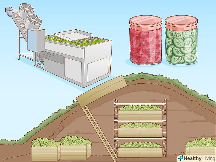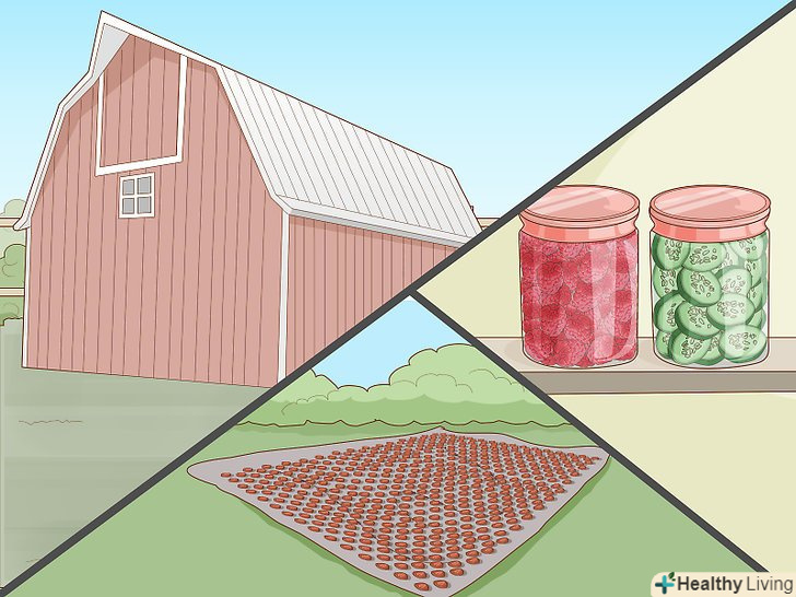 Продумайте способи зберігання. якщо ви збираєтеся вирощувати зернові, вам знадобляться комори, які збережуть ваш урожай в сухості і безпеки від комах і гризунів. Якщо ви збираєтеся виробляти їжу для власного споживання, то краще продумати поєднану систему для зберігання і консервації вашого врожаю. Отже, основні способи зберігання врожаю:- Сушка. Цей метод дуже корисний і ефективний для зберігання фруктів і деяких овочів. Сушку можна здійснити в будь-якому сухому і теплому кліматі, без будь-яких високотехнологічних гаджетів.