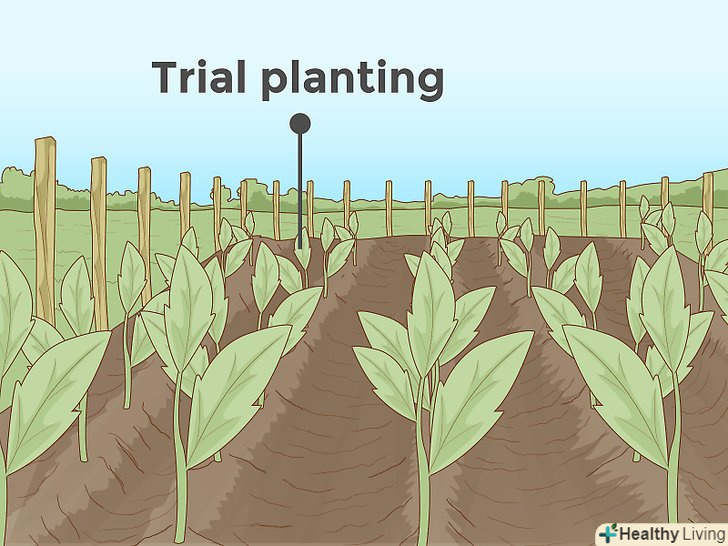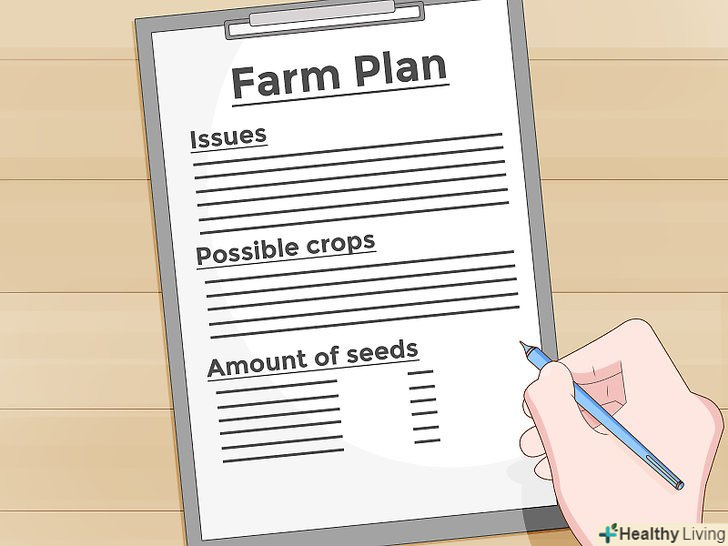 Розробіть план посадки на вашій ділянці. при плануванні вам потрібно буде врахувати чимало важливих деталей, таких як: вторгнення диких тварин, яке може зажадати установку огорожі або паркану, відкритий доступ сонячних променів, оскільки деяким культурам потрібна більша, ніж іншим, кількість сонячного світла для гарного росту, і топографію, адже посів на занадто рельєфних грунтах може привести до багатьох неприємностей.- Складіть список всіх культур, які можливо вирощувати на вашій ділянці. Ваш список повинен бути різноманітним і відповідати поживним цінностям, про які згадувалося раніше. Поговоривши з іншими фермерами і вивчивши інформацію від виробників насіння, ви зможете приблизно оцінити потенційний урожай з кожного окремо взятого рослини. Використовуючи ваш список і план посадки, розроблений вами раніше, ви зможете приблизно підрахувати необхідну вам кількість насіння. Якщо площа ділянки дозволяє, засійте Додаткові насіння на випадок якщо деякі з основних не зійдуть або рослини загинуть, внаслідок неправильного догляду, адже ви тільки починаєте і ще не впевнені в результатах своєї роботи.
