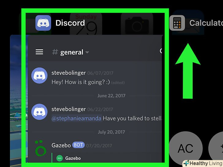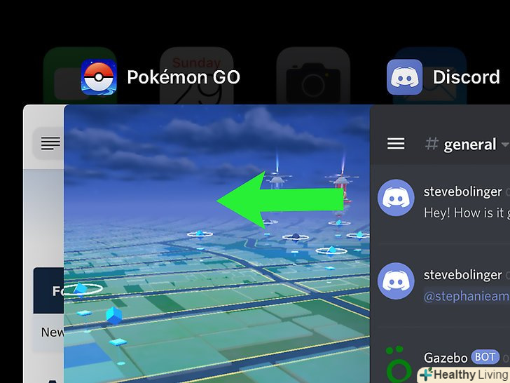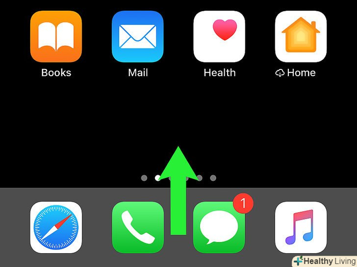 Проведіть знизу вгору по Головному екрану.якщо на iPhone/iPad кнопки "Додому" немає (в нижній центральній частині екрана), ця дія призведе до відкриття списку всіх запущених додатків.[5]- Якщо на iPhone/iPad є кнопка "Додому" (у нижній центральній частині екрана), двічі натисніть (швидко) цю кнопку, щоб відкрити список запущених додатків.
