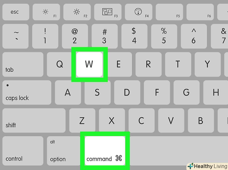 Натисніть⌘ CMD+W, щоб закрити активне вікно.це поєднання клавіш працює так само, як натискання на значок у вигляді червоного гуртка у верхньому лівому кутку.- Якщо відкрита програма з вкладками, наприклад веб-браузер, вказане поєднання клавіш дозволить закрити тільки активну вкладку. Щоб закрити всі відкриті вкладки у вікні, натискайте⌘ CMD+W, поки не закриються всі вкладки.