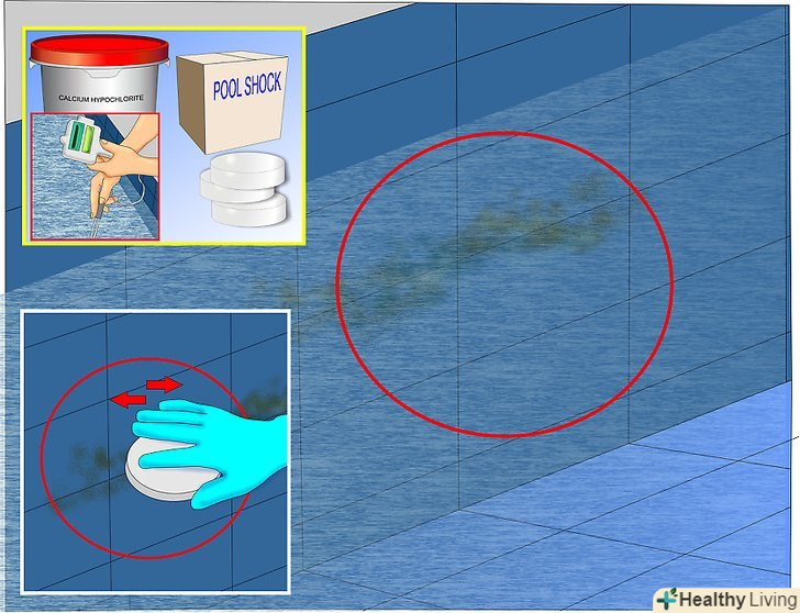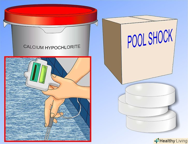 Шокуйте басейн. при шокуванні басейну хлором необхідно використовувати тільки гіпохлорит кальцію або гіпохлорит натрію. Ці 2 продукти містять тільки хлор і більше нічого. Вам потрібно дізнатися, якого розміру ваш басейн і дотримуйтесь інструкцій виробників, щоб зробити це ефективно. Також хороша ідея-додати шокуючу дозу найближче до найбільш постраждалих місць.