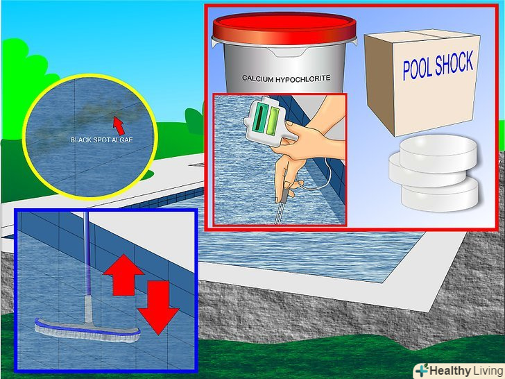 Перевірте воду. єдина причина, по якій чорні водорості знаходяться у вашому басейні – це відсутність в ньому хлору. Для запобігання раптової появи чорних водоростей ви повинні постійно, кожен день перевіряти якість води. Ви повинні робити це в будь-якому випадку. Необхідно перевіряти на хлор, рН, лужність, жорсткість кальцію, стабілізатор і т.д. Ви зможете перевірити це тільки на невеликій кількості води за допомогою домашнього тестового набору. Рекомендується, щоб ви взяли пробу води і віднесли в найближчий магазин з продажу басейнів і отримали його професійні результати. У будь-якому випадку будь-який пристойний магазин з продажу басейнів буде пропонувати безкоштовні тести води.