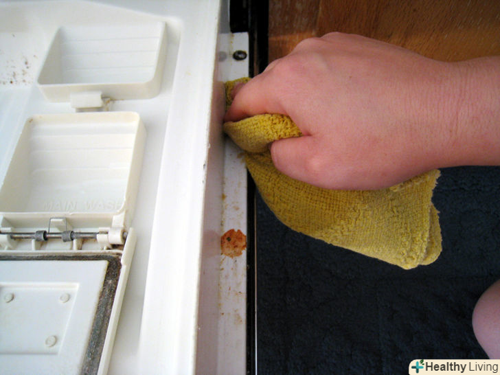Протріть краї дверцят і навколо кошиків. ці місця не промиваються під час циклу роботи Посудомийки. Візьміть суху ганчірку і розчин оцту (або, якщо хочете, несильний миючий засіб). Стара зубна щітка або інша м'яка щітка допоможуть вам дістатися в кути, а також під кошики.- Не забудьте нижню частину дверцят і під нею! У деяких посудомийках це сліпа зона куди не потрапляє вода і там може накопичуватися сміття. Протріть це місце ганчіркою змоченою в оцті. Якщо щось прикипіло, скористайтеся щіткою.
