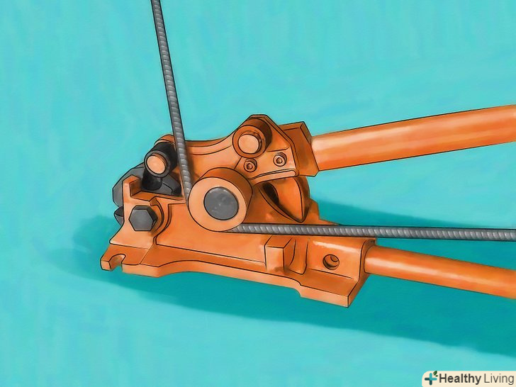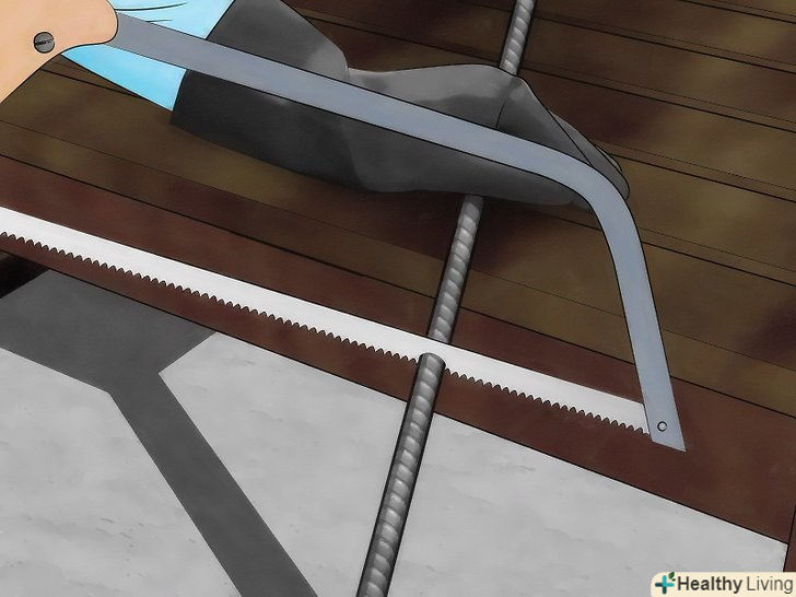 Відріжте арматуру. різання арматури можна легко виконати за допомогою ножівки по металу. Ви також можете використовувати шабельну пилу, портативну стрічкову пилу або шліфувальний верстат, оснащений придатним для різання "м'якої сталі" лезом. Арматура має тенденцію скручуватися при різанні, Отже, як правило потрібно наступати на неї або утримувати її іншим способом в процесі різання. відрізана арматура завжди гаряча і/або гостра. Користуйтеся рукавичками і будьте обережні.
