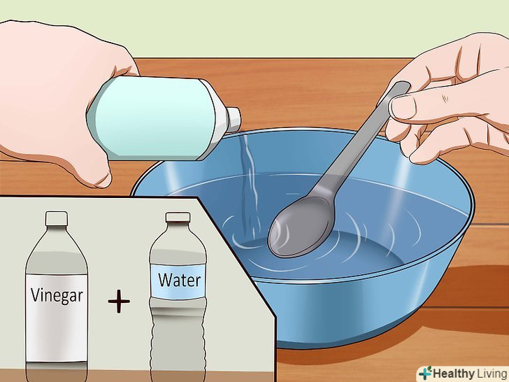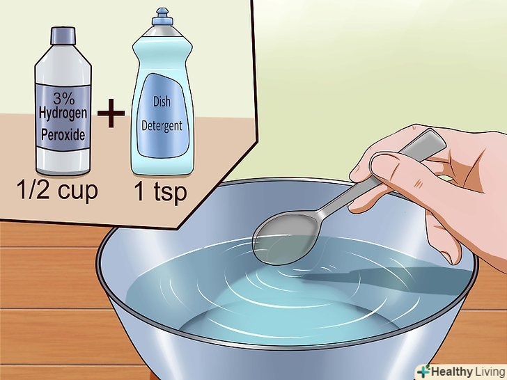 Змішайте трохи перекису водню із засобом для миття посуду. змішайте ½ склянки 3% перекису водню і 5 мл (1 чайна ложка) засобу для миття посуду. Розпорошите отриманий розчин поверх харчової соди. [5]- Найкраще випробувати цей розчин на непомітній ділянці, щоб зрозуміти, чи не пошкодиться поверхня, і чи не зміниться її колір.