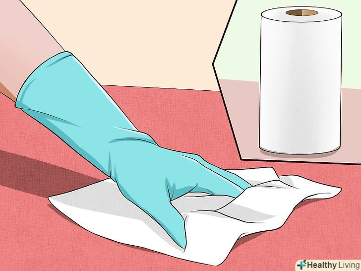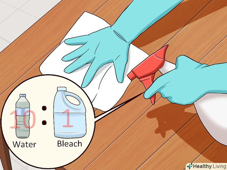 Продезінфікуйте тверді поверхні. вимийте забруднену область побутовим миючим засобом, який не містить аміак. Аміак пахне, як котяча сеча. Потріть цю область чистою водою. Потім в пляшці-розпилювачі змішайте воду і відбілювач в пропорції 10:1 відповідно. Одягніть гумові рукавички і розпорошите розчин на забруднену область. Зачекайте близько 30 секунд, а потім протріть забруднену область вологою ганчіркою.- Будьте обережні з хлоркою, тому що вона може роз'їсти і пошкодити деякі матеріали і змінити їх колір.