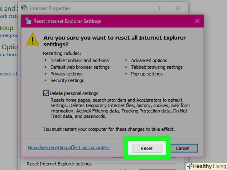 - Встановіть прапорець біля "видалити персональні налаштування «і натисніть»Скидання".