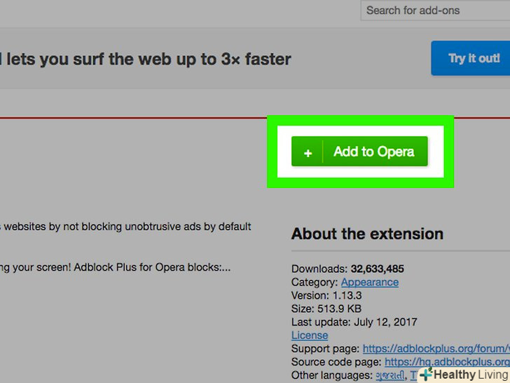 Натисніть "Додати в Opera" на сторінці розширення.через кілька секунд на панелі інструментів Opera з'явиться значок. Ви будете повідомлені, коли установка завершиться.- Коли блокувальник реклами буде встановлений, можна користуватися Інтернетом, причому реклама з'являтися не буде.
