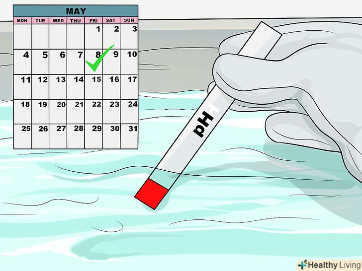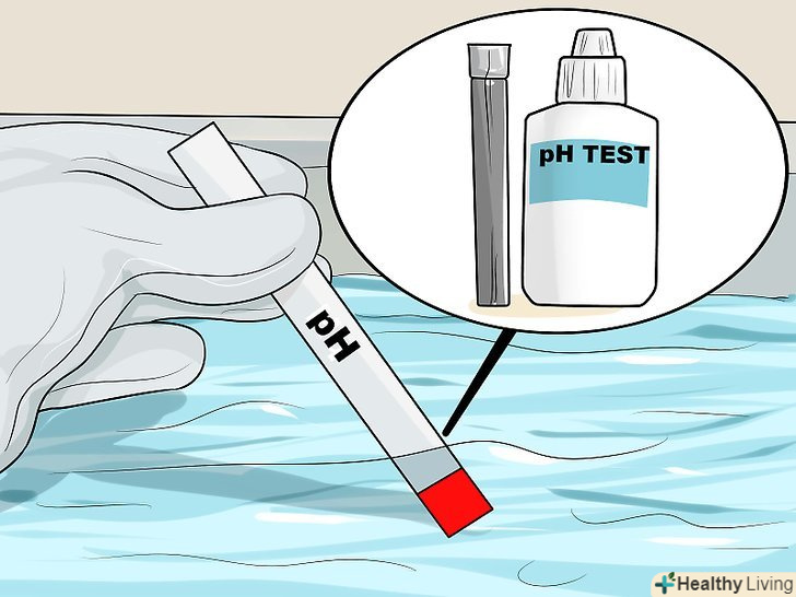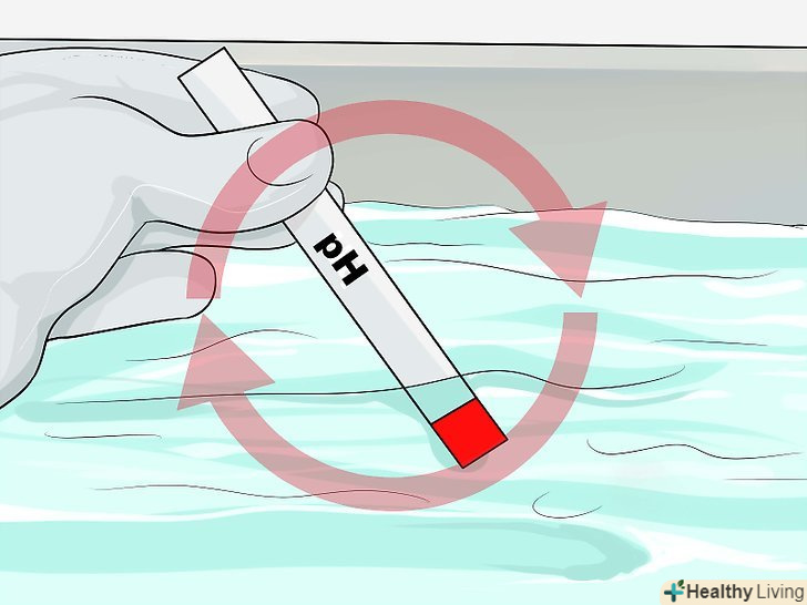Відрегулюйте рівень pH в басейні. виміряйте рівень рН води за допомогою набору для визначення рівня рН у басейнах. Якщо рівень pH вище 7,6, що часто трапляється при цвітінні водоростей, додайте у воду засіб для зниження рівня pH (наприклад, бісульфат натрію) відповідно до вказівок на упаковці. Слідкуйте за тим, щоб рівень pH знаходився в межах 7,2–7,6 — в цьому випадку хлор буде діяти більш ефективно, що скоротить зростання водоростей. [3] зачекайте принаймні дві години, потім перевірте рівень рН ще раз.- Тестові набори, в яких використовуються таблетки або піпетки, набагато точніші, ніж паперові тест-смужки. [4]