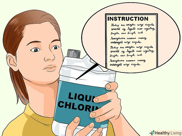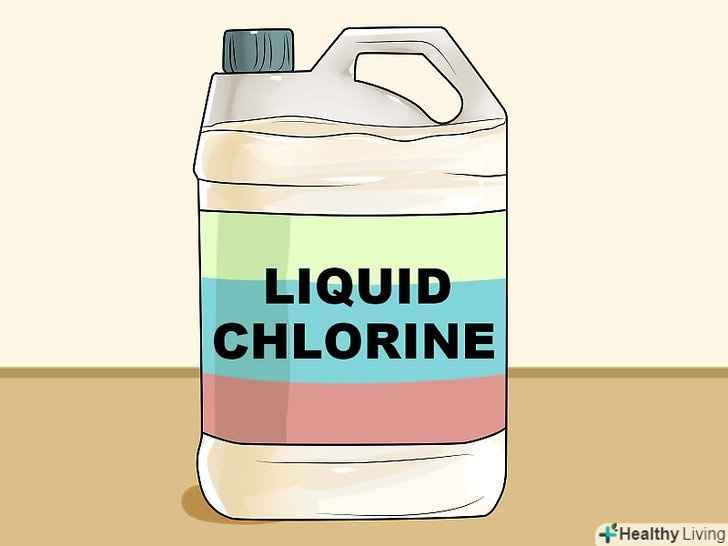 Виберіть засіб для шокового хлорування басейну. Хлор, який ви регулярно додаєте в басейн, може бути не найкращим засобом для швидкого очищення води. Найкраще використовувати рідкий засіб з хлором, спеціально призначене для басейнів. Цей засіб повинен містити гіпохлорит натрію, кальцію або літію. [5]- Не використовуйте засіб з гіпохлоритом кальцію, якщо у вас жорстка вода.