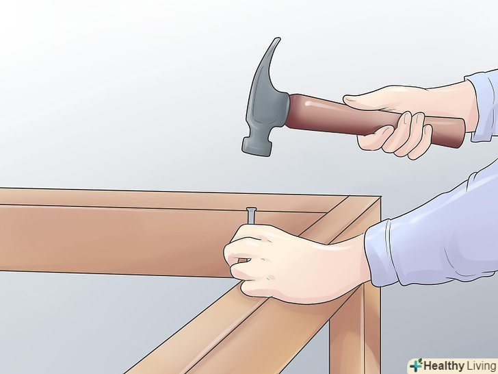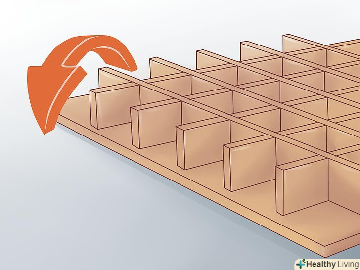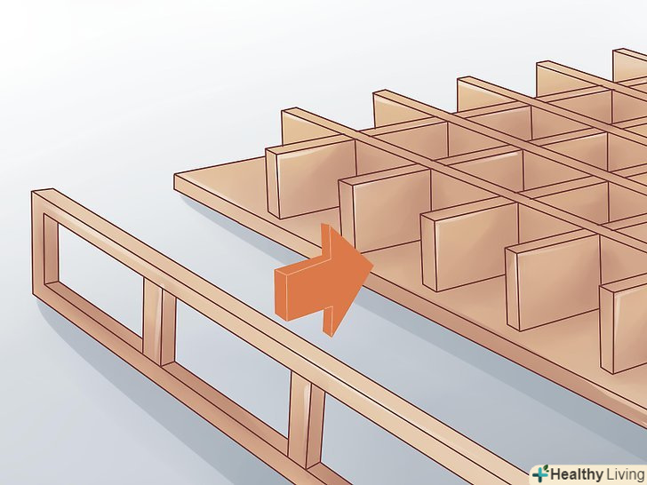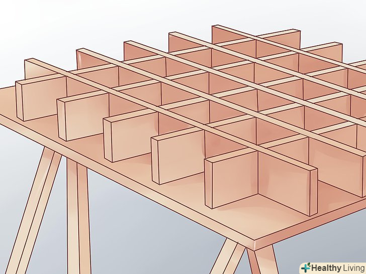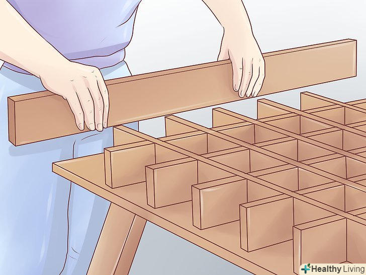 Після того, як клей висох, переверніть готовий каркас таким чином, щоб ребра жорсткості були внизу. переконайтеся, що клітини квадратні і відповідають рівню. Потім зробіть розмітку на торцевій стороні кришки верстата. Зафіксуйте верхню кришку до ребер жорсткості, використовуючи паркетні цвяхи. Завдяки цьому ви отримаєте більш міцну конструкцію.