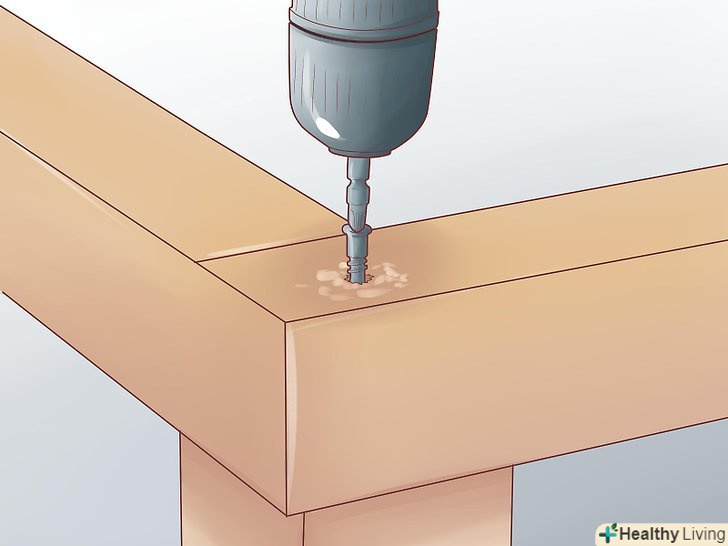 За допомогою клею і шурупів прикріпіть підставу (обрізану раму 5х15) до ніжок, до попередньо позначеного кінця на підставі. за допомогою косинця перевірте, щоб ніжки були перпендикулярні основи. Це додасть основи акуратності. Шурупи повинні бути досить довгими, щоб пройти крізь підставу/рейки і на 2-5 см увійти в ніжки, але не проходити їх наскрізь.