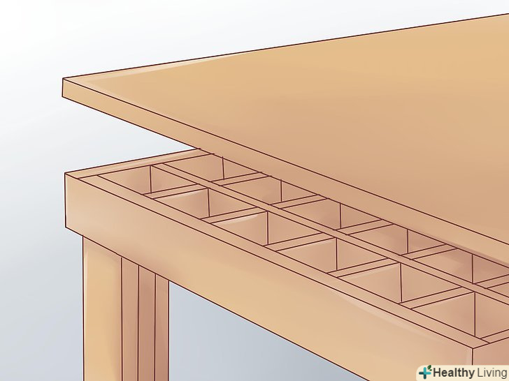 Виготовте зовнішній каркас, використовуючи матеріали з яких будуть зроблені ребра жорсткості вашого верстата. для закріплення каркаса попередньо просвердлите отвори або використовуйте степлер і клей. Встановіть каркас на лист фанери або МДФ. Встановіть каркас по намічених лініях. Для закріплення каркаса візьміть досить довгі шурупи або скоби, щоб зафіксувати його на внутрішній стороні майбутньої поверхні верстата. Зробіть виміри чотирьох кутів каркаса. Розмір повинен бути однаковим. Зафіксуйте каркас на аркуші МДФ або фанери, використовуючи клей, степлер або шурупи. Каркас повинен відповідати Вашим розмірам.