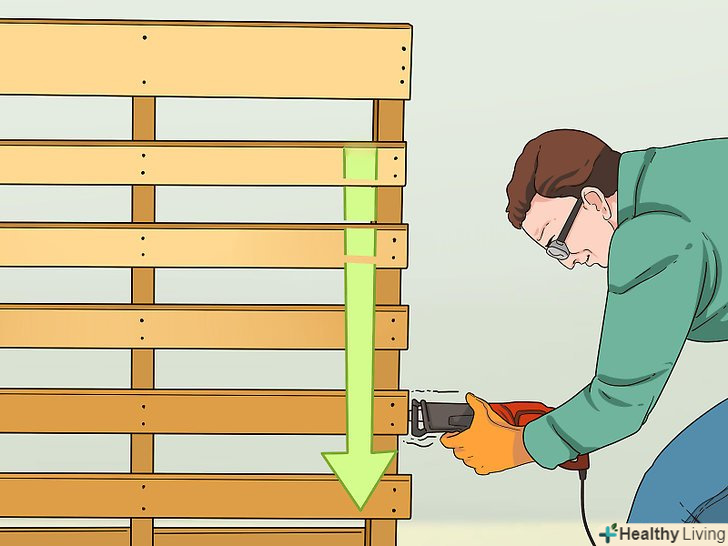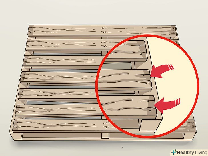 Знайдіть дві основні вертикальні дерев'яні дошки на піддоні. менші горизонтальні рейки, як правило, 2 х 4 повинні бути прибиті до цих дощок, щоб створити верхню поверхню піддону. Вам потрібно буде зрізати цвяхи вздовж вертикальних частин, де горизонтальні і вертикальні рейки перетинаються.