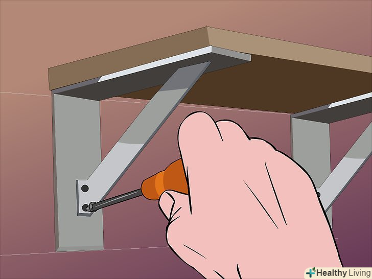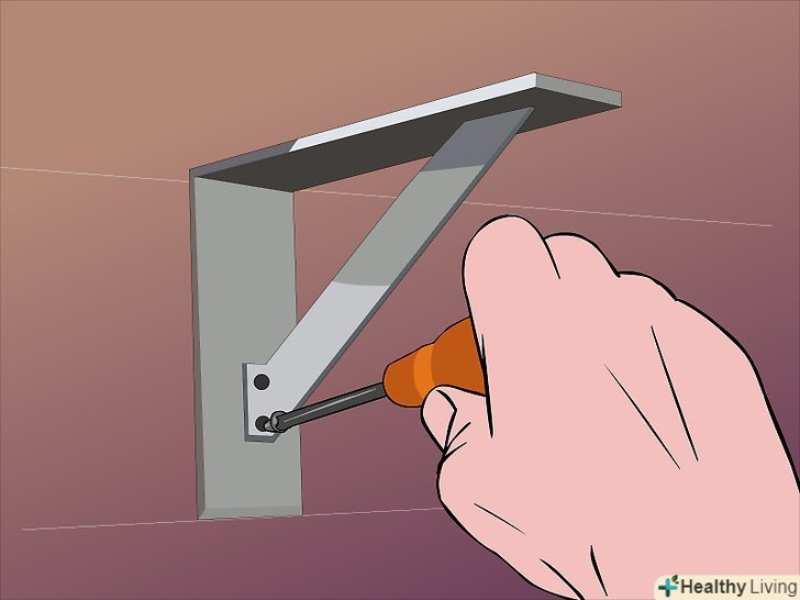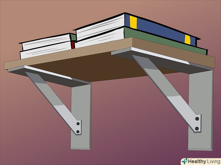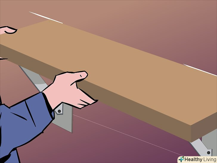 Виберіть кріплення для полиці в залежності від її виду. у деяких випадках кріплення заховані, але як би там не було, будь полиці потрібна якась опора.- Дерев'яні планки: просто і ефективно-дерев'яні планки або блоки використовують, щоб утримати полицю на місці. Планки, прибиті до обох кінців полиці, також відомі як клиноподібна підтримка. Щоб приховати бічні клини, можна прибити дерев'яну рейку уздовж лицьової частини: Simple but effective, wood strips or blocks can be used to keep shelves in place.