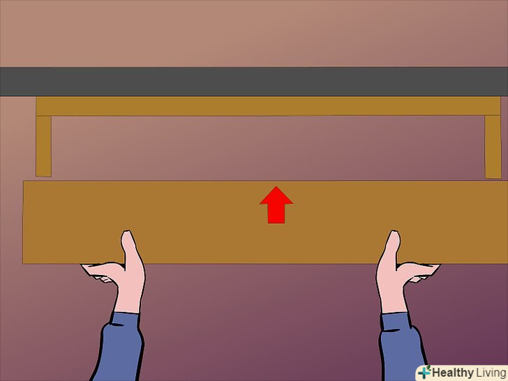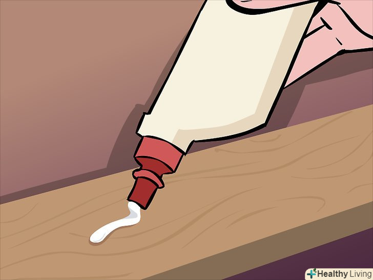 Додаємо верхню полицю. для цього рівня клин не потрібен. Ця дошка повинна бути трохи ширше інших, щоб її можна було прибити, прикрутити шурупами або приклеїти до верхівок двох вертикальних опорних панелей.- Якщо вам потрібно буде розібрати полки, не треба приклеювати верхню. Краще скористайтеся шурупами, їх легко витягти і потім знову вкрутити після повторної збірки.