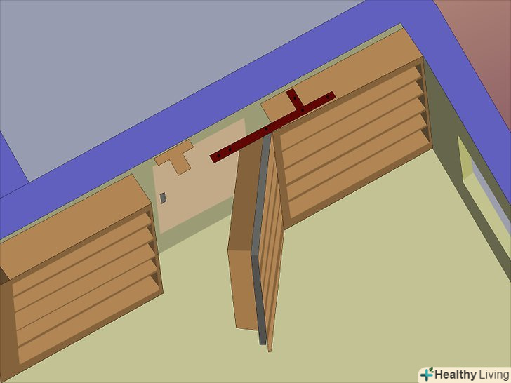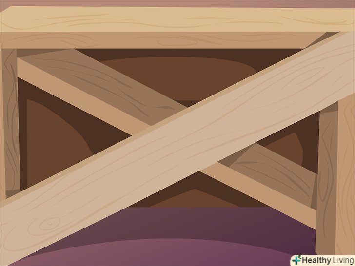 Додаємо задню стінку. стелаж ризикує завалитися набік або впасти, якщо не додати задню стінку. Прибийте або посадіть на клей задню стінку стелажа.- Ще один варіант – використовувати перехресне посилення замість однієї деревної плити. Що Вам подобається більше, то і використовуйте.
