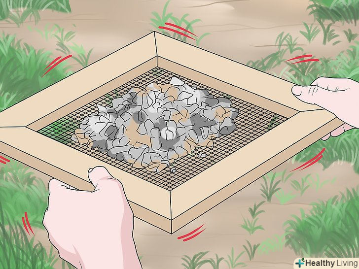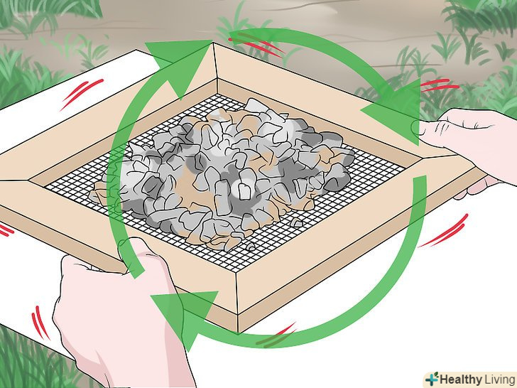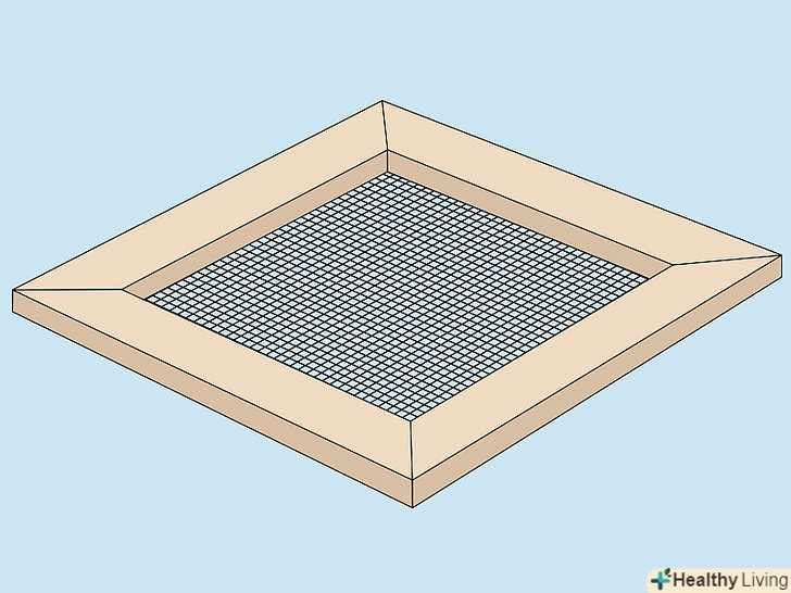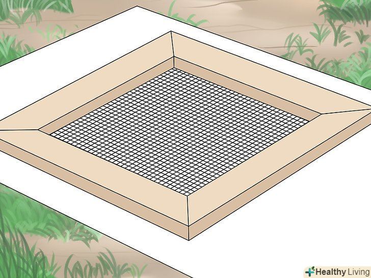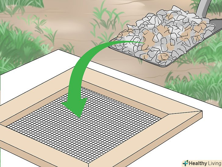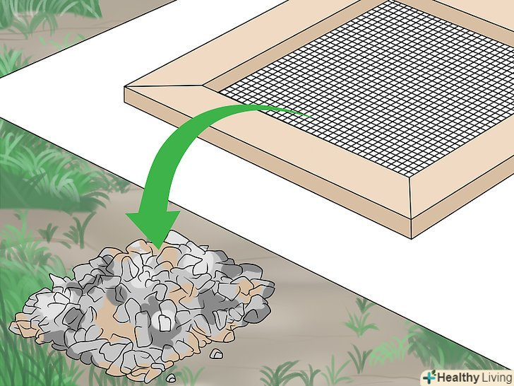 Зробіть раму для сітки з деревини для великих обсягів. використовуйте дошки розміром 5 на 10 сантиметрів (які знайдуться під рукою), щоб зробити прямокутну раму величиною хоча б 0,35 квадратних метрів. Сітку слід обрізати за розміром рами і прикріпити до деревини за допомогою міцних скоб. [2]- Решето можна зробити будь-якого розміру. У даній статті запропонований мінімальний відповідний розмір (0,35 квадратних метрів), але площа може бути набагато більше. У деяких випадках потрібно встановити дерев'яні ребра жорсткості поперек сітки під рамою, щоб камені не продавили сітку.