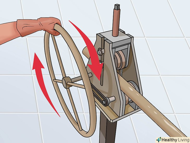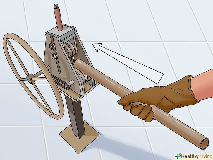 Подайте трубу в верстат. більшість трубопрокатних верстатів забезпечені великим колесом, що прокручується при прокатці труби.- Прокручування колеса зажадає певних зусиль, особливо на завершальних етапах прокатки.