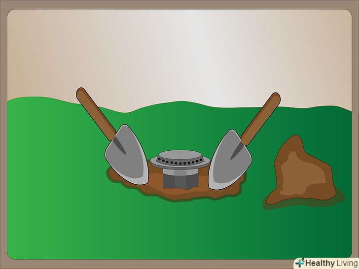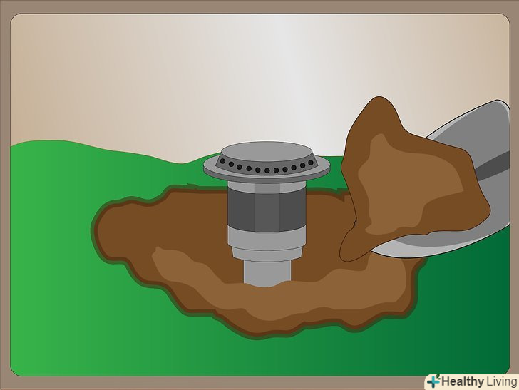 Обережно приберіть бруд від головки розбризкувача. зберіть її поруч в купу; вона знадобиться вам пізніше для наповнення ямки. Акуратно копайте далі, поки не дістанете до водопровідної труби (приблизно 15-20 см під травою).