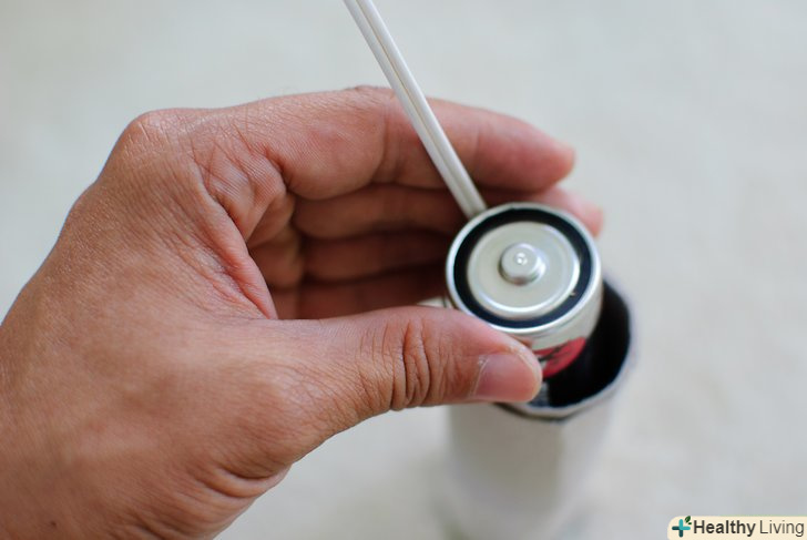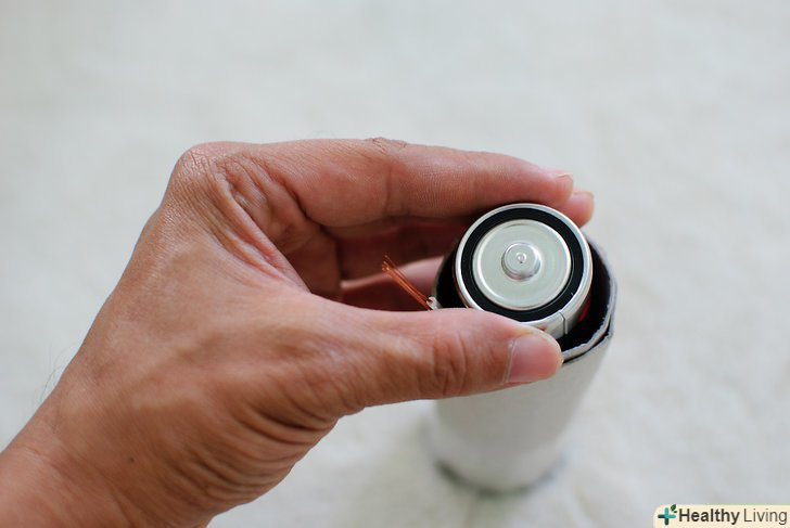 Вставте батарейку в картонку від рулону туалетного паперу приклеєним проводом вперед. хоча провід спрямований в сторону заклеєного кінця картонки, другий кінець дроту повинен висовуватися з отвору картонки.- Якщо дріт недостатньо довгий, щоб обернути кінець батарейки, подрежьте картонку.