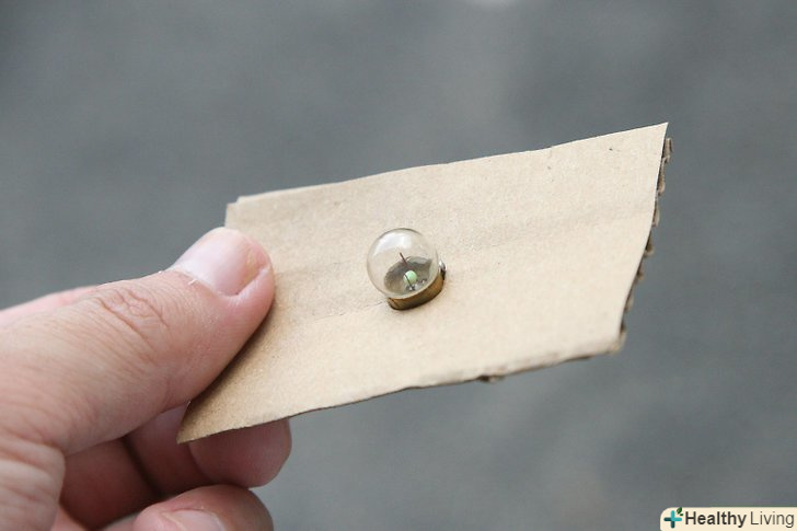 Приклейте лампочку до верху батарейки. переконайтеся, що між двома поверхнями існує пряме з'єднання ( по суті, переконайтеся в міцності конструкції). Переконайтеся, що нижня частина лампочки все ще видно.