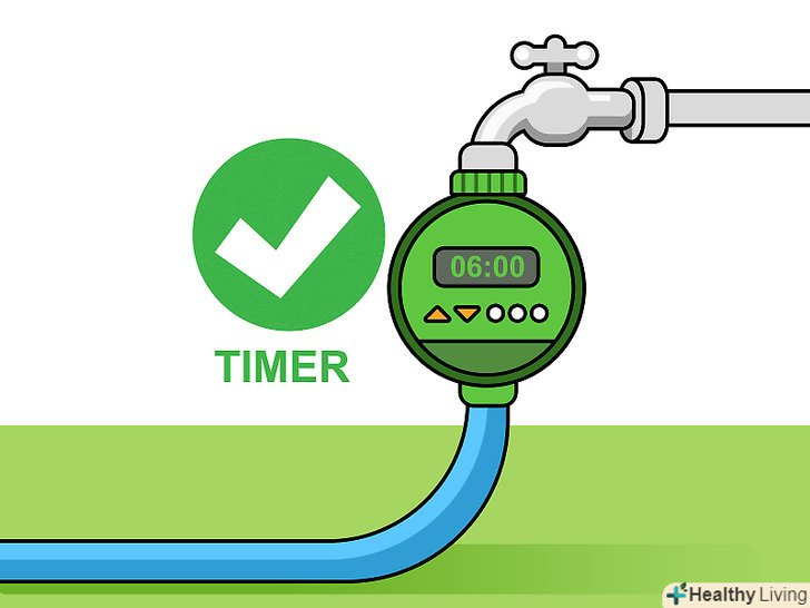 Встановіть таймери на систему автополиву. встановіть таймери на крани вуличної подачі води і розбризкувачі системи автополиву. Пошукайте недорогі автоматичні таймери, які встановлюються між шлангом і поливальним ніпелем, або встановіть програмований таймер на систему розбризкувачів або крапельного поливу. Автоматичний таймер також допоможе вам організувати полив саме в той час доби, коли вода найкращим чином вбирається в грунт. [22]- Якщо ви включаєте полив вручну, користуйтеся кухонним таймером для своєчасного відключення подачі води або весь час невідривно стежте за процесом поливу.