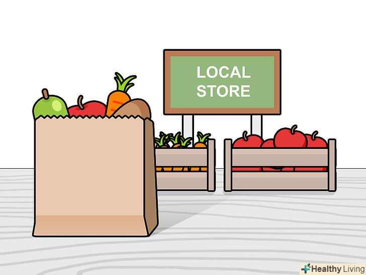 Купуйте і вживайте місцеві продукти. якщо продуктам, одязі та іншим товарам доводиться долати далекі відстані до свого споживача, то на це витрачається чимало води. Ця вода задіюється у виробництві бензину, який необхідний для транспортування, тому постарайтеся купувати місцеві продукти і товари, щоб знизити водний слід. [32]- Купуйте харчові продукти на місцевих фермерських ринках і шукайте магазини, в яких продаються товари місцевих виробників (наприклад, одяг).