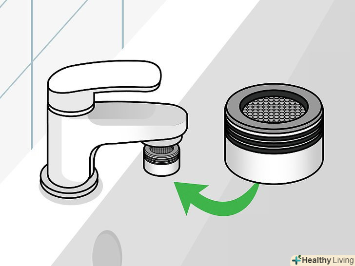 Встановіть аератори на змішувачі. наявність аератора на змішувачах дозволяє збагачувати воду киснем, створювати більш стабільний потік і менше витрачати воду в цілому. Встановити аератор досить просто — його потрібно тільки нагвинтити на кран; а коштує він, в середньому, від декількох десятків рублів до пари сотень. [6]