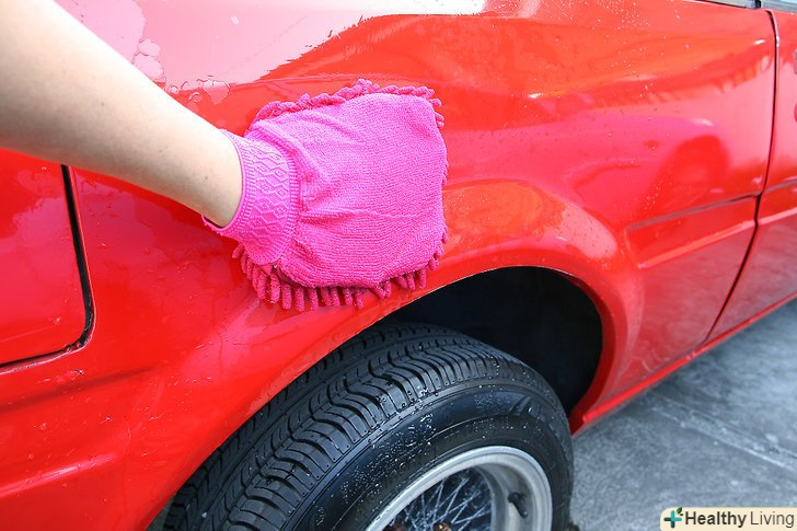 Візуально розбийте автомобіль на 4 частини, змочіть ганчірку і приступайте до першої секції. спочатку вимийте кузов, потім мийте колеса, таким чином, ви зменшите шанс підібрати шматок бруду з коліс, яким можна подряпати фарбу автомобіля. Часто обполіскуйте ганчірку. Якщо у вас немає рукавиці з мікрофібри, використовуйте звичайну ганчірку з мікрофібри. Частинки бруду повинні легко відлипати від кузова, якщо їх трохи потерти. Якщо деякі місця не відмиваються, спробуйте дати їм відмокнути, поки миєте решті обрану ділянку машини.