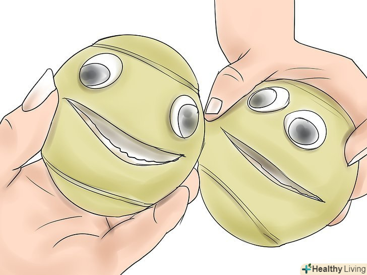 Робіть вироби або корисні подарунки з тенісних м'ячів. з тенісних м'ячів вийдуть чудові іграшки, вироби та прикраси:- Прикрасьте тенісні м'ячі для свого художнього проекту. Намалюйте очі, ніс, рот і приклейте волосся, щоб вийшла мила лялькова голова; наклейте материки, щоб вийшов глобус. І не бійтеся склеювати кілька м'ячів, щоб створити складну конструкцію.