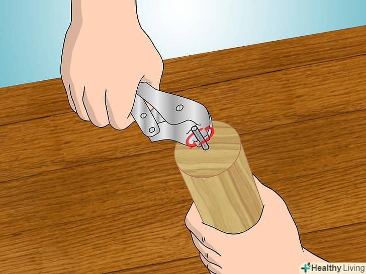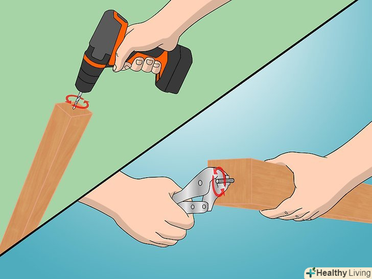 Встановіть болти з вушком і вушком всередині ваших ніжок для столу. відзначте центр ніжки олівцем або маркером. Зробіть отвір в ніжці, а потім щільно вкрутіть болт з вушком і вушком в верхню частину кожної ніжки.- Почніть вкручувати гвинт від руки. Далі використовуйте плоскогубці, щоб затягнути його, поки він не буде закріплений. [1]