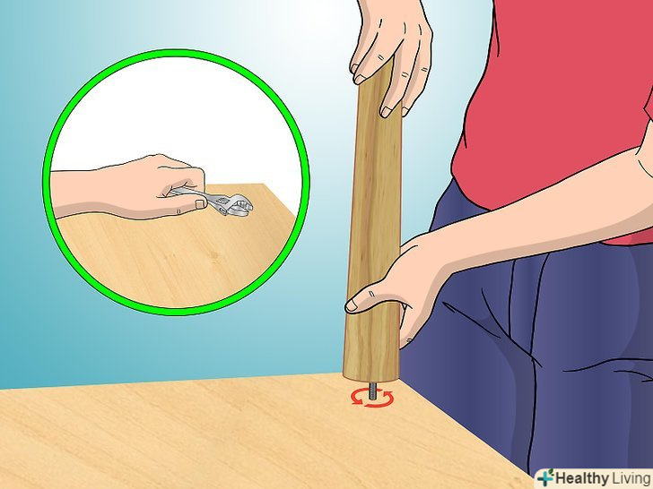 Скручуйте ніжки в середину підстави, поки вони не з'єднаються з верхньою частиною. тоді прикрутіть гайку середнього розміру на верхню частину болта, щоб закріпити його. Повторіть з трьома залишилися ніжками. [3]- Перевірте ваш стіл, щоб переконатися, що він рівний, перш ніж закінчити роботу і прикріпити верхній шар.