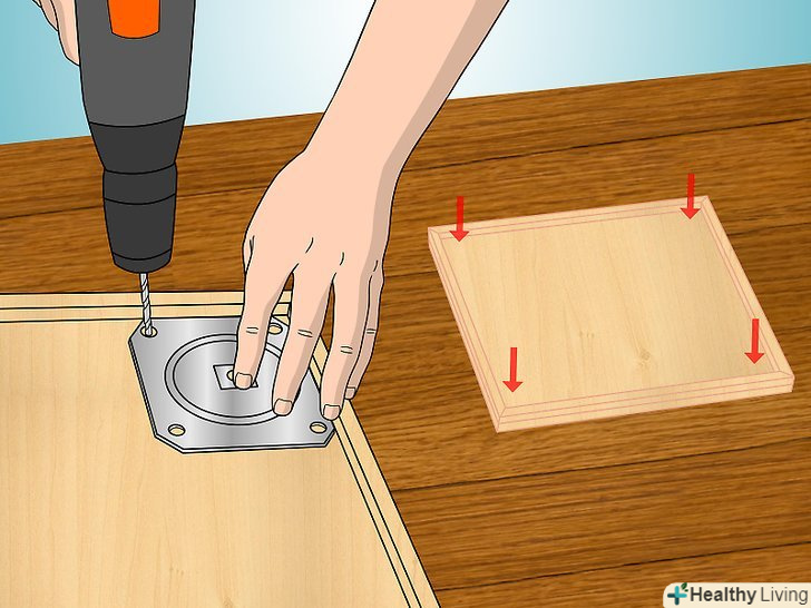 Вирівняйте зовнішню сторону стільниці проти сторони протилежного кута. затисніть його на місце або попросіть кого-небудь потримати його. Скрутіть його за допомогою чотирьох гвинтів. [2]- Якщо ви купили комплект столових приладів, то можливо, що він був упакований за допомогою чотирьох гвинтів по дереву.