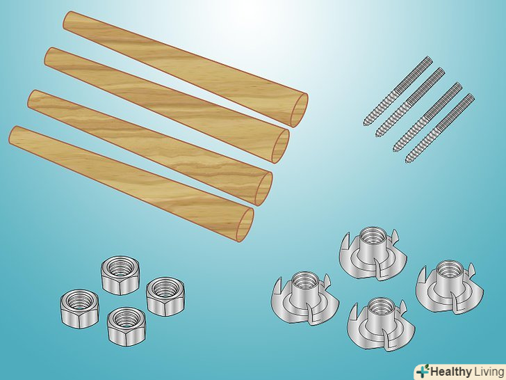Придбайте чотири ніжки для столу, Т-подібні гайки, і болти з вушком і вушками в магазині товарів для дому. Ви можете знайти необроблені ніжки і все обладнання, необхідне для їх установки, в найбільш великих господарських магазинах.