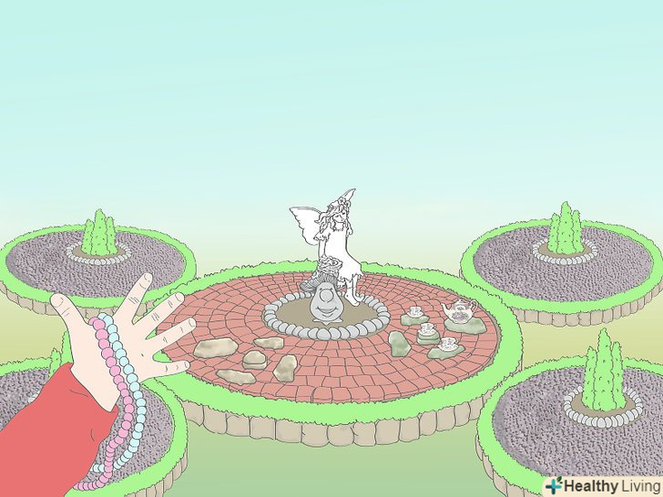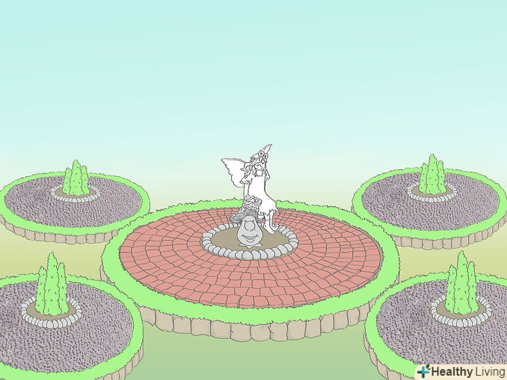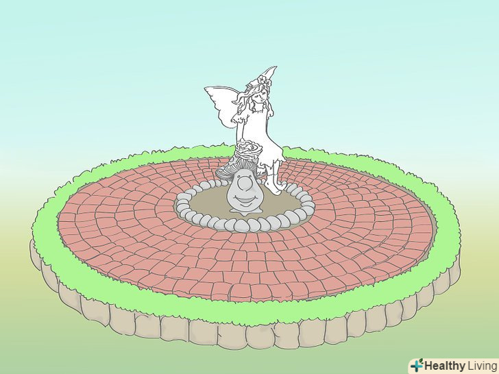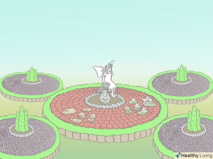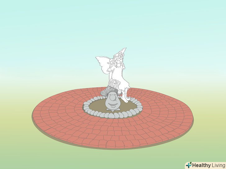 Вимостіть каменем квадратну або круглу площадку, на якій буде розташовуватися ключова тематична частина. ідеально підходить цементна цегла теракотового кольору. Поставте скульптуру в центр квадрата або кола, наприклад гриб, фею, тварина або інший тематичний елемент, який вибрав дитина.