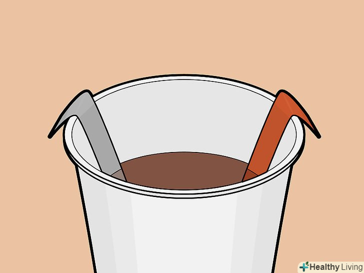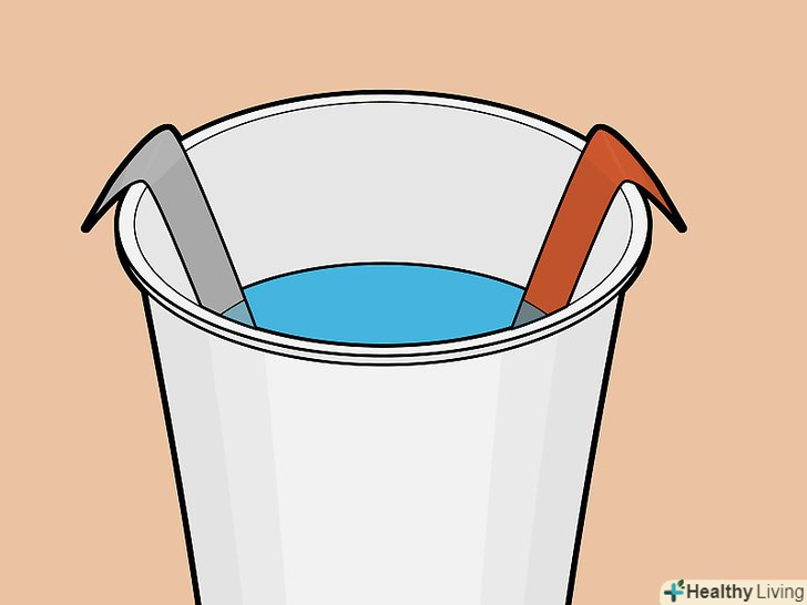 Опустіть в стакан дві металеві смужки. простежте, щоб вони занурилися в воду, а їх краю виступали над обідком склянки. Якщо смужки занадто короткі, загніть їх краю і повісьте на ободок склянки, так щоб вони занурилися в водний розчин.