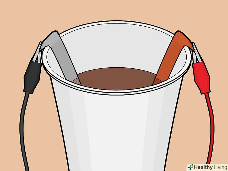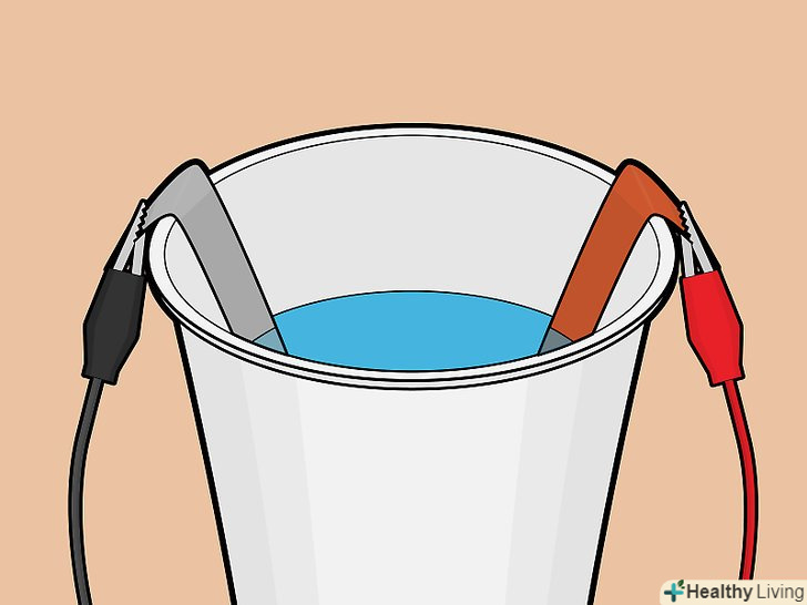 Підключіть до металевих смужок дроту. Візьміть один провід, розкрийте затиск «крокодил» і захопіть їм край смужки. Потім таким же чином підключіть інший провід до другої смужці.- Будьте обережні і стежте, щоб затискачі не торкалися рідини.