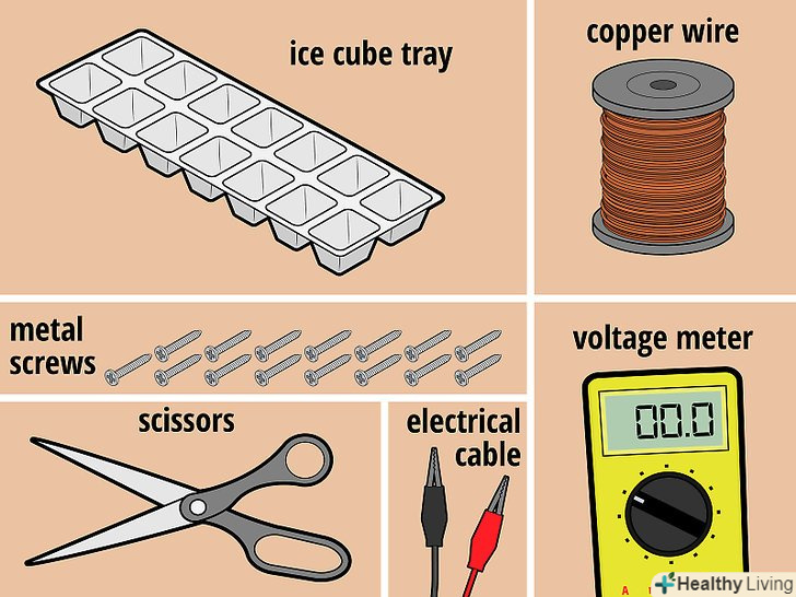 Запасіться всім необхідним. для даного гальванічного елемента вам знадобиться трохи мідного дроту, 15 шурупів для скріплення тонколистового металу, форма для льоду і вода. [2] крім того, будуть потрібні ножиці, вольтметр і два дроти з затискачами "крокодил" на обох кінцях. Необхідно буде обмотати всі шурупи мідним дротом, за винятком одного, який послужить негативним висновком (до нього ви приєднаєте один з проводів після того, як зберете гальванічний елемент).- Кількість шурупів залежить від числа осередків у формі для льоду. У нашому прикладі ми використовуємо форму з 14 осередками.
