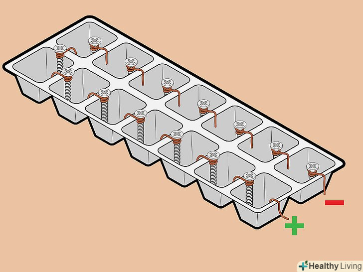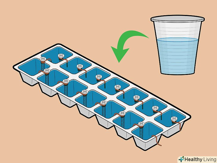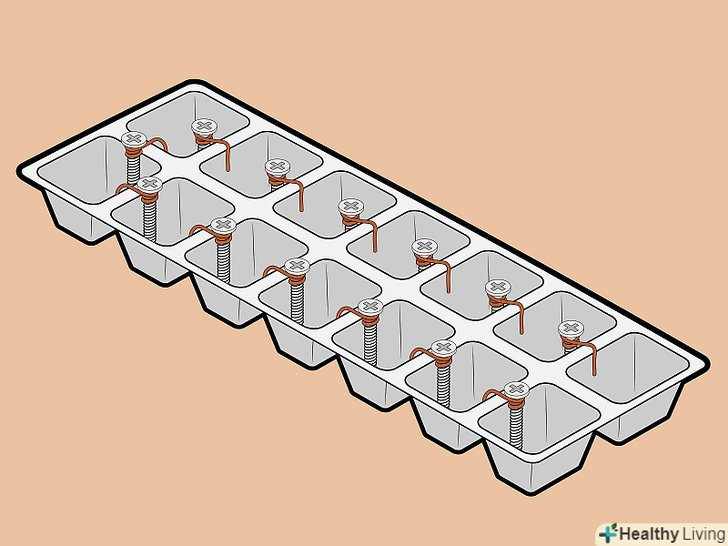 Помістіть по одному шурупу в кожну клітинку форми для льоду. це будуть окремі осередки гальванічного елемента. Підвісьте шурупи на краю осередків. Слідкуйте, щоб в кожній комірці розташовувався лише один шуруп.