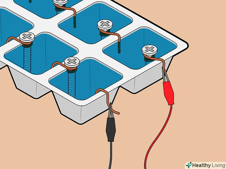 Підключіть до одного краю форми для льоду позитивний і негативний висновки. Начепіть на зовнішню сторону однієї з осередків форми для льоду гачок з мідного дроту. З цієї ж сторони форми, але на сусідній осередку розмістіть шуруп. Цей шуруп повинен виступати над краєм форми, оскільки до нього необхідно буде під'єднати провід.