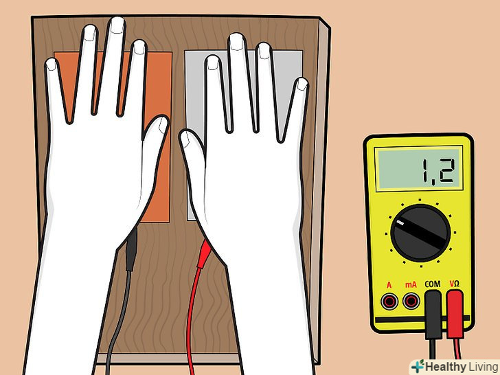 Покладіть долоню на кожну пластинку. коли ви покладете на пластинки по одній долоні, піт на ваших руках вступить у взаємодію з металевою поверхнею, і вольтметр покаже деяку напругу.- Якщо на вольтметрі залишиться нульова напруга, поміняйте місцями дроти: підключіть провід від мідної пластинки до тієї клеми, до якої був підключений провід від алюмінієвої пластинки, і навпаки.