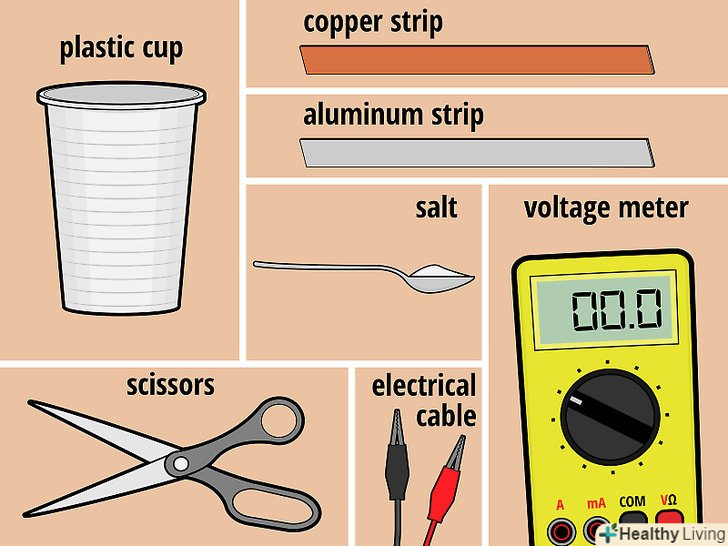 Запасіться всім необхідним. для даного виду гальванічного елемента вам знадобляться один пластиковий стакан (об'ємом від 180 до 240 мілілітрів), дві металеві смужки шириною 2 сантиметри, довжина яких трохи перевищує висоту склянки, і одна столова ложка (20 грамів) солі. Смужки повинні бути з різних металів, наприклад з цинку, алюмінію або міді. Крім того, вам будуть потрібні ножиці, вольтметр і два дроти з затискачами «крокодил» на обох кінцях.- Замість однієї столової ложки (20 грамів) солі можна додати у воду 1 чайну ложку (7 грамів) солі, 1 чайну ложку (5 мілілітрів) оцту і кілька крапель хлорного відбілювача. Якщо ви виберете цей варіант, будьте обережні, оскільки відбілювач є небезпечною хімічною речовиною.
