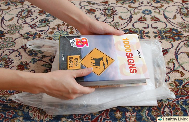Висушіть килим. накрийте вологе пляма чистим, сухим кухонним рушником або міцними паперовими рушниками. Накрийте їх звичайним поліетиленовим пакетом, а потім притисніть пляма важким предметом, наприклад, великою книгою. Зачекайте кілька годин або залиште рушники на ніч.