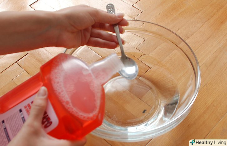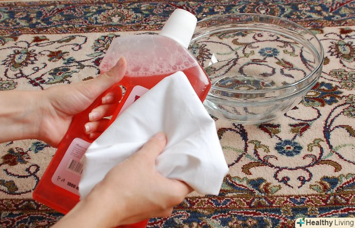 Приготуйте миючий розчин. додайте на один літр холодної води ¼ чайної ложки м'якого миючого засобу або шампуні для чищення килимів. У підходящої посуді ретельно перемішайте отриманий розчин.