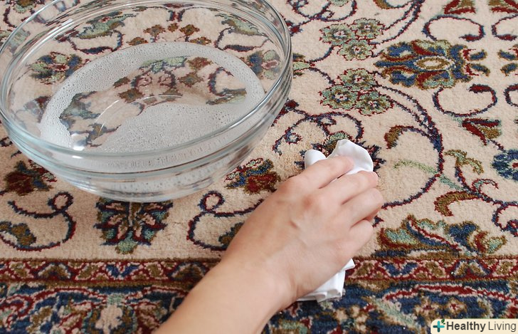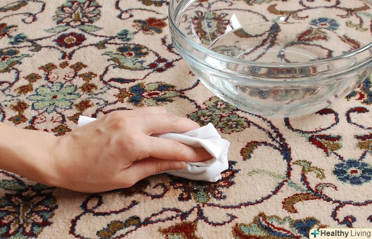 Промийте пляму. приберіть мокру ганчірку з килима і протріть пляму теплою водою. Крім того, ви можете помочити чисту губку в теплій воді і обережно промокнути пляму.
